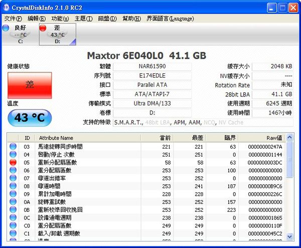 下面的軟體螢幕截圖為一台快要掛點的舊電腦利用 CrystalDiskInfo 先前版本檢查硬碟的結果,從畫面可看出,D 槽的健康狀態差,以紅色表示,而 C 槽健康狀態良好,以藍色表示。