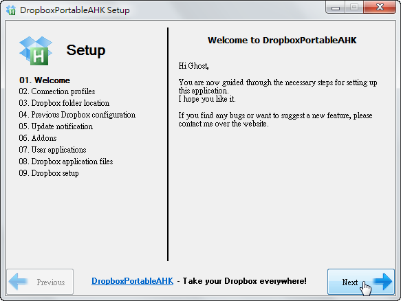 Dropbox可攜版 - DropboxPortableAHK,作者使用「AutoHotkey」設計的程式,將它解壓縮於USB或隨身碟,依照步驟操作,最後會從網路下載最新版的官方版程式,下載及設定完成後就可以於隨身碟使用,也就是說不需要管理者權限也可以使用了,可以在同一個電腦使用者帳號下管理多個Dropbox帳號,還會自動檢查最新版本。