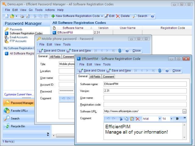 Efficient Password Manager 不但可幫助您記住一般的密碼資料,而且還能紀錄網站登入密碼、軟體註冊碼、e-mail 帳號密碼 或甚至 FTP 帳號密碼等等。程式還內建隨機密碼產生器,可節省您建立新密碼的時間。事實上,用隨機密碼產生器產生的密碼通常比較安全。