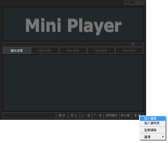 台灣製造免費MP3播放軟體 - Mini Player,支援Unicode檔名,可以播放副檔名為WAV、MP3、TAK、OGG、FLAC、WMA的音樂,支援Pls、M3u 、M3u8播放清單,支援關閉循環、單曲播放、循環播放、隨機播放等播放模式,載入歌曲的速度快、體積小、功能單純。