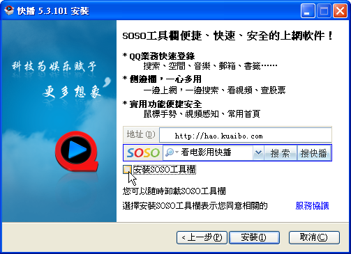 安裝前取消勾選「安裝SOSO工具欄」。