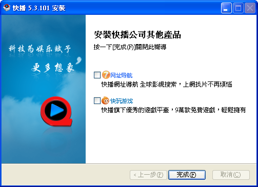 安裝後取消勾選「安裝快播公司其他產品」下方的所有選項。