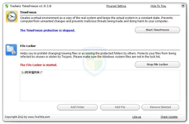 免費電腦軟體還原卡 - ToolWiz Time Freeze,有「Time Freeze」跟「File Locker」兩大功能,「Time Freeze」功能啟動後,會把所有電腦的異動(如:安裝移除軟體)都暫存起來,當停止該功能時,可以選擇儲存或者還原!「File Locker」可以保護資料夾或檔案,經保護後會拿掉檔案的變更跟讀取權限,以防止病毒感染或檔案安全;另外,軟體介面可以設定密碼保護,以防止他人變更設定。