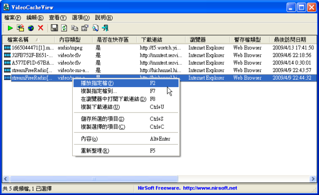 如果您的系統安裝有播放影片的軟體,VideoCacheView 還可讓您從瀏覽器快取中直接播放影片。