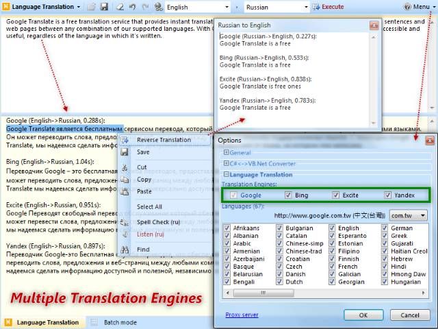 •首創線上翻譯 (Google + Yahoo + Live + Excite):共計 60 國語言互轉,四合一整合可方便對照尋求最佳翻譯結果。