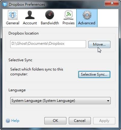 您可以點選右下角圖示後選擇「Preferences」來設定要同步的資料夾路徑。在本機資料夾的操作方式與一般拖曳檔案一樣,只要將檔案拉進 Dropbox 資料夾就可以上傳檔案,而將檔案拉出 Dropbox 資料夾就是下載檔案。