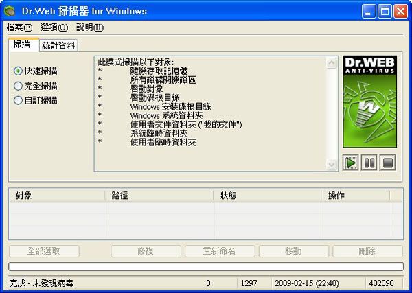 但由於 Dr.Web CureIT! 是免費的免安裝軟體,所以沒有常駐的功能,但其掃毒跟解毒的能力可是一流的,非常適合拿來幫中毒的電腦解毒。如果您的系統最近好像怪怪地,懷疑可能中毒,那麼 Dr.Web CureIT! 就是您即時的好幫手,正好馬上派上用場,很快就可解除您心中的疑惑。