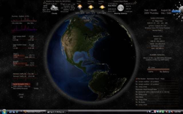 Rainmeter 是一款可以顯示系統資訊、天氣溫度及時鐘的桌面美化軟體,它可以顯示 CPU 使用率、硬碟空間、記憶體空間、網路速度、時間等資訊,也可以顯示圖片相框和氣象資訊,並且與 Winamp 播放程式連動,在面板上顯示播放的曲目、演唱者、備註等資訊,還可直接控制上下曲目、音量、開啟播放音樂等功能,是一套頗受歡迎的免費桌面美化軟體。尤有甚者,Rainmeter 的面板 (Skins) 資源相當豐富,可以從網路上下載各式各樣,不同功能、不同性質的面板,亦可自製面板。