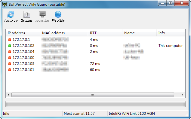 檢查哪些設備連上了你的無線網路 - SoftPerfect WiFi Guard,開啟此軟體並選擇你的無線網路卡,按下掃描(Scan Now)就可以顯示使用你無線網路的設備資料,包括:設備IP位址(IP address)、網路卡MAC位址(MAC address)、反應時間(RTT)、電腦名稱(Name)...等等,比較特別的是,如果有未知的設備試圖連線,它會主動提出警告!