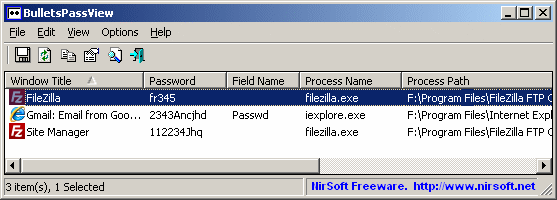 BulletsPassView是一個密碼恢復工具,揭示的Windows操作系統和Internet Explorer Web瀏覽器的標準密碼文本框後面的子彈存儲的密碼。揭示了密碼後,你可以很容易地將它們複製到剪貼板或將其保存到文本/ HTML / CSV / XML文件。