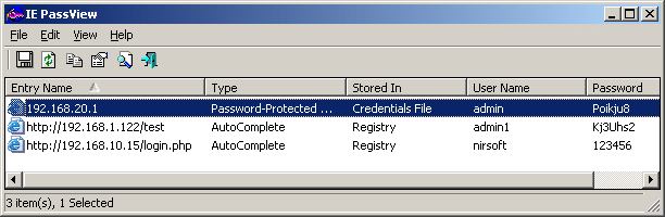 由Internet Explorer的每一個密碼,存儲,顯示以下信息:網址,密碼類型(自動完成密碼保護的Web站點或FTP),存儲位置(註冊表,證書文 件,或受保護的存儲),用戶名/密碼對。您可以選擇一個或多個項目的密碼列表,並將其導出到文本/ HTML / CSV / XML文件。